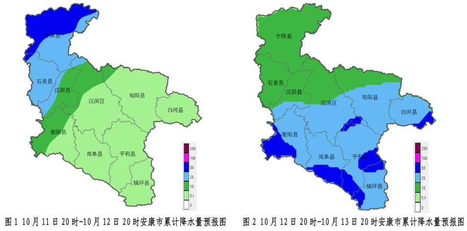 10月12日:全市大部陰天轉大雨(25~45毫米),紫陽大部、嵐皋南部、平利中南部、鎮(zhèn)坪、漢濱南部、白河局地有暴雨(超過50毫米),過程期間局地伴有雨強超過10毫米/小時的強降水;