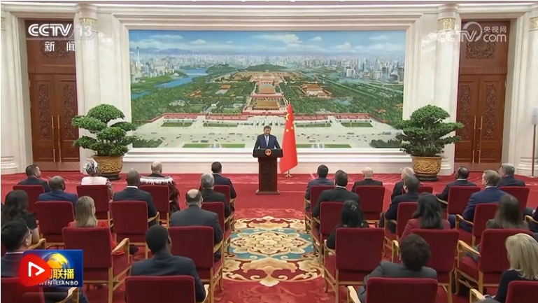 儀式結(jié)束后,習近平在北京廳對使節(jié)們發(fā)表講話。