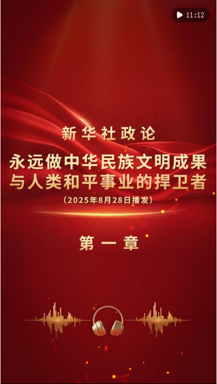 新華社8月28日播發(fā)《新華社政論|永遠(yuǎn)做中華民族文明成果與人類和平事業(yè)的捍衛(wèi)者——寫在中國人民抗日戰(zhàn)爭暨世界反法西斯戰(zhàn)爭勝利80周年之際》。我們邀請誦讀嘉賓任志宏演播“第一章”。aLH安康新聞網(wǎng)