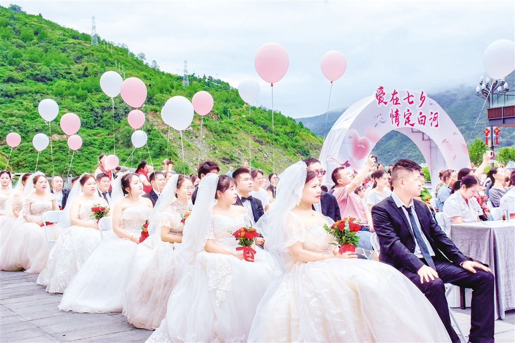 8月29日上午,“愛(ài)在七夕·情定白河”2025年白河縣新時(shí)代文明實(shí)踐集體婚禮主題活動(dòng)在河街寶石文化廣場(chǎng)浪漫啟幕。來(lái)自各行各業(yè)的8對(duì)“珍珠婚”夫婦、8對(duì)新人齊聚一堂,通過(guò)分享婚姻保鮮秘訣、頒發(fā)結(jié)婚證、簽訂承諾書(shū)、開(kāi)展婚姻家庭輔導(dǎo)等簡(jiǎn)約而莊重的儀式,在各界代表和親朋好友的見(jiàn)證祝福下,開(kāi)啟幸;橐鲂缕,用實(shí)際行動(dòng)踐行婚事新辦、喜事儉辦的文明新風(fēng)尚。(紀(jì)道婭 攝)