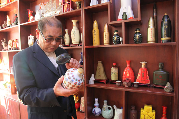 趙久剛 攝 在白河縣縣城獅子山濱河大道的退休老干部柴敦益,十五年來,收藏了2500余千個 “寶貝”——酒瓶。 10月13日下午,在柴敦益老人家中,筆……